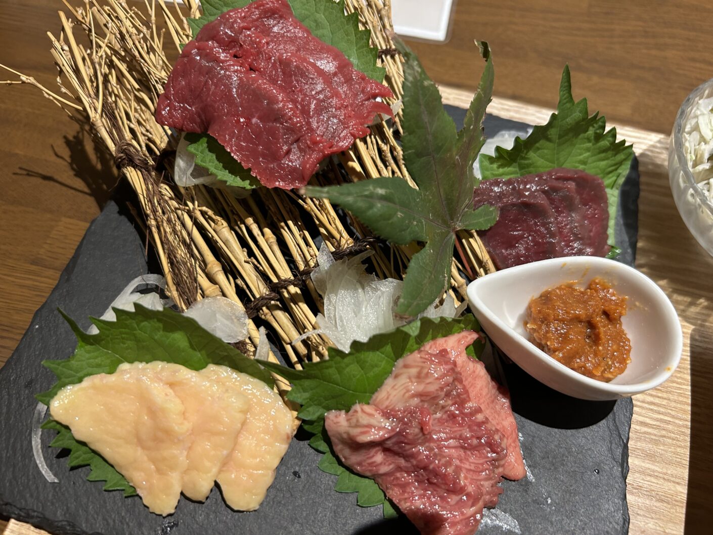 新潟市西区の「さくらの町屋」さんの馬刺し4種盛り。いつ行っても美味しい。こんなに美味しい馬刺しが近くでいつでも食べれるの、ほんと幸せ♡この日はなぜか、ニンニク味噌がいつもの倍くらいお皿に入ってきて嬉しかった〜これがまた良いのですー