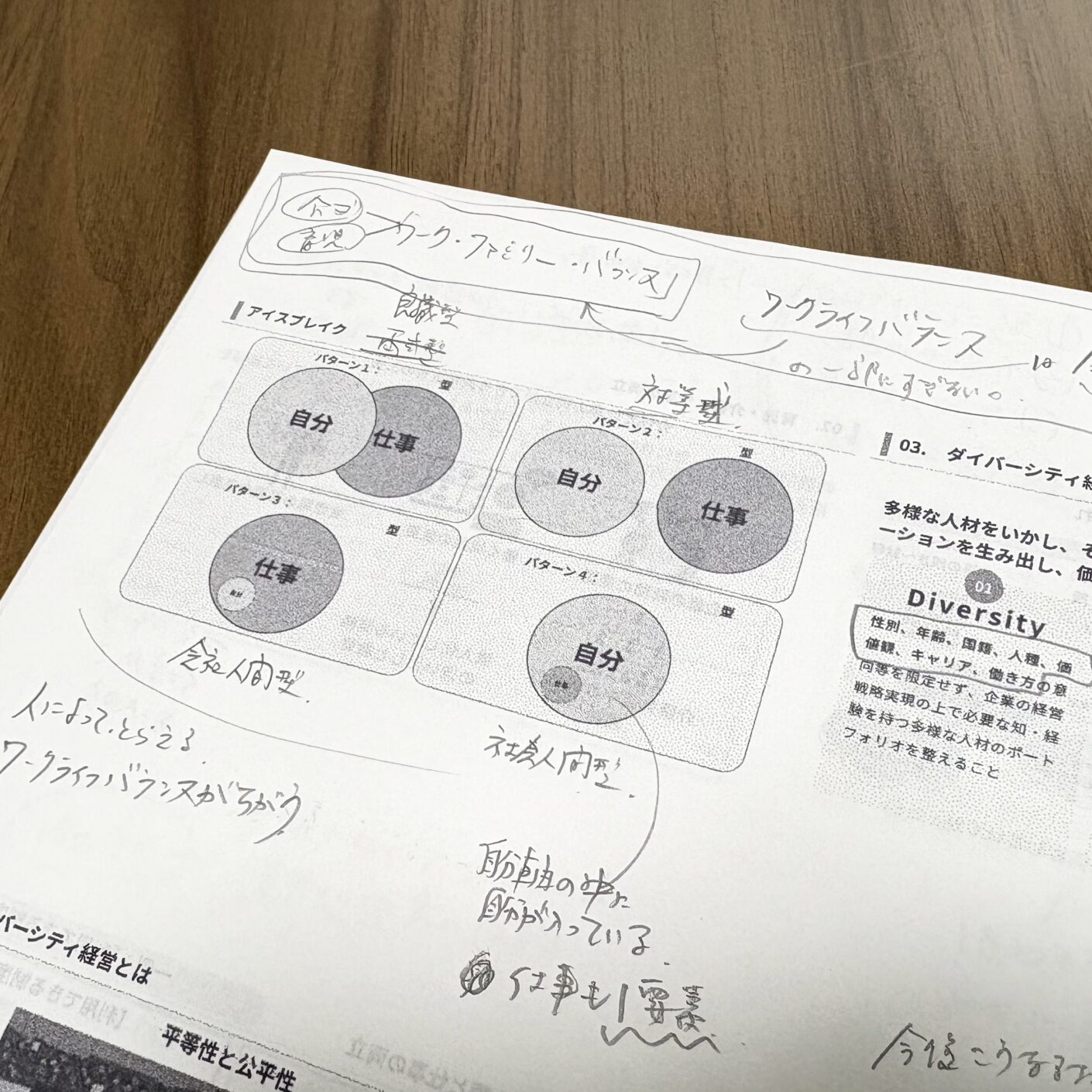 特にこちらの写真の「アイスブレイク」の「仕事と自分の円」が印象深く、その後、先生が仰っていた「育児や介護はワーク・ファミリー・バランスで、ワーク・ライフ・バランスの一部に過ぎない。ワーク・ライフ・バランスはみんなにあるもの」という言葉に、鈍器で頭を殴られたような衝撃を受けました。