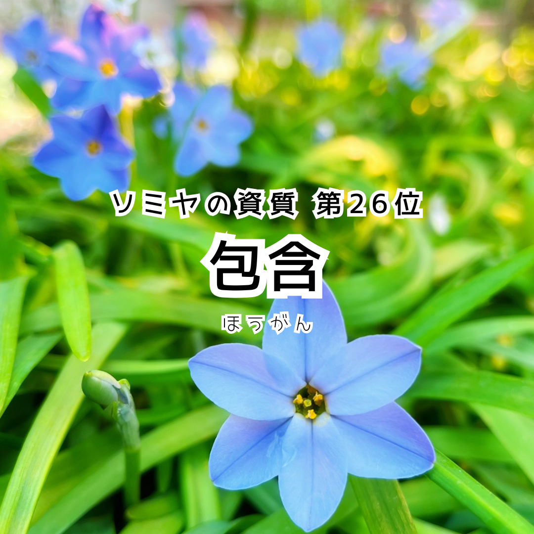 「包含」は冒頭にある通り、「寛大な心と包容力がある人」。私も周囲からはこう見られることが多いのですが(なぜだろう?穏やかそうな雰囲気だけは出せているからだろうか…?笑)、実際は寛大でもなく、包容力もないです。多様性を受け入れられる方だとは思いますが、それは「理解できる・尊重できる」程度で、全てを受け入れられるような懐の深さは無いです。基本的には、他人にも自分にも厳しい眼差しを向けるタイプです。